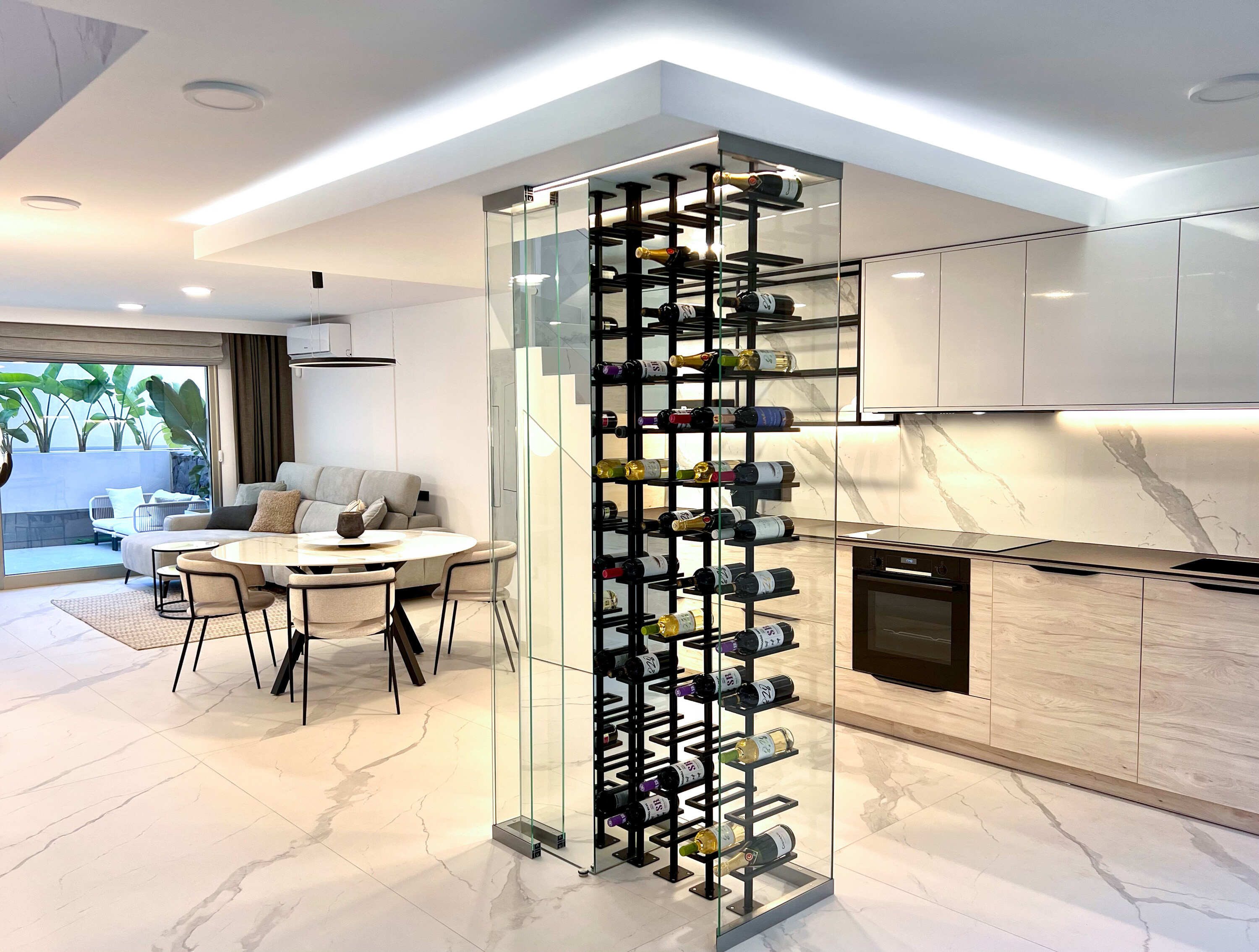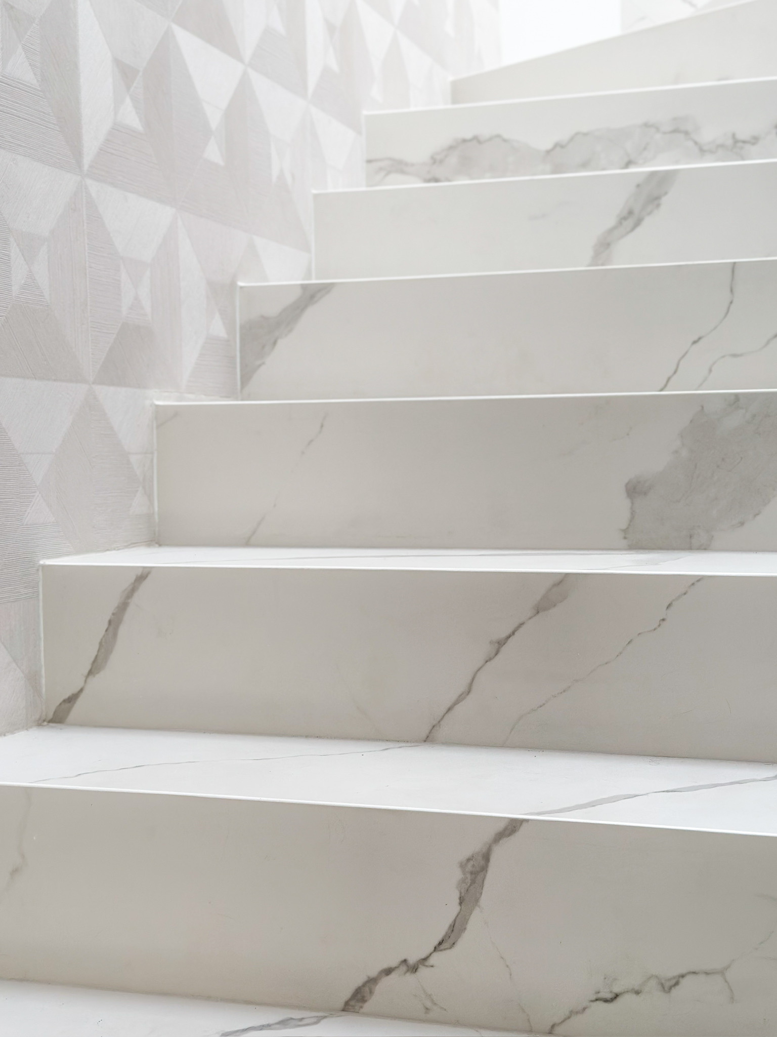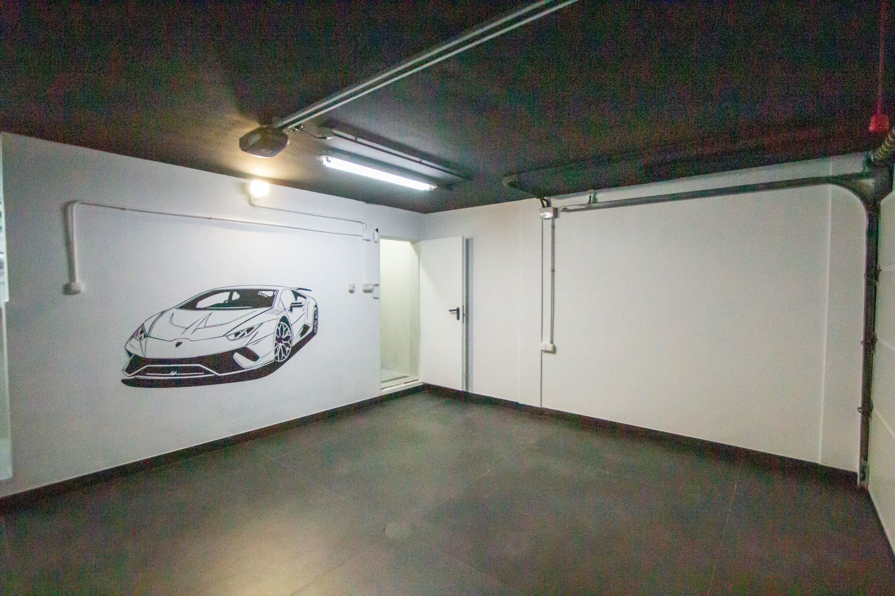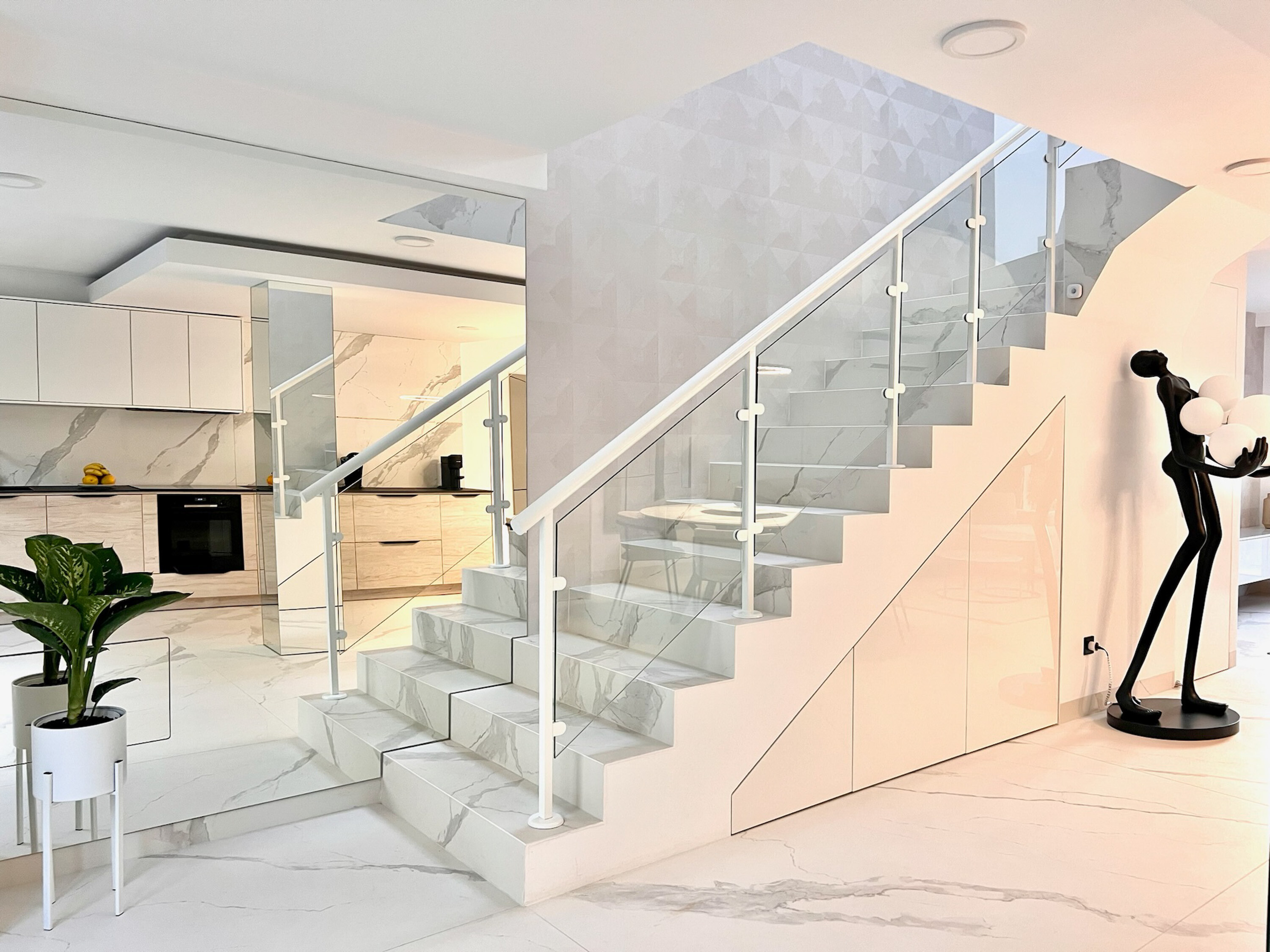 Posadzki, schody, blaty kuchenne, ściany w łazienkach i garażu wykonane w ultra wytrzymałych spieków kwarcowych m. in Lamborghini