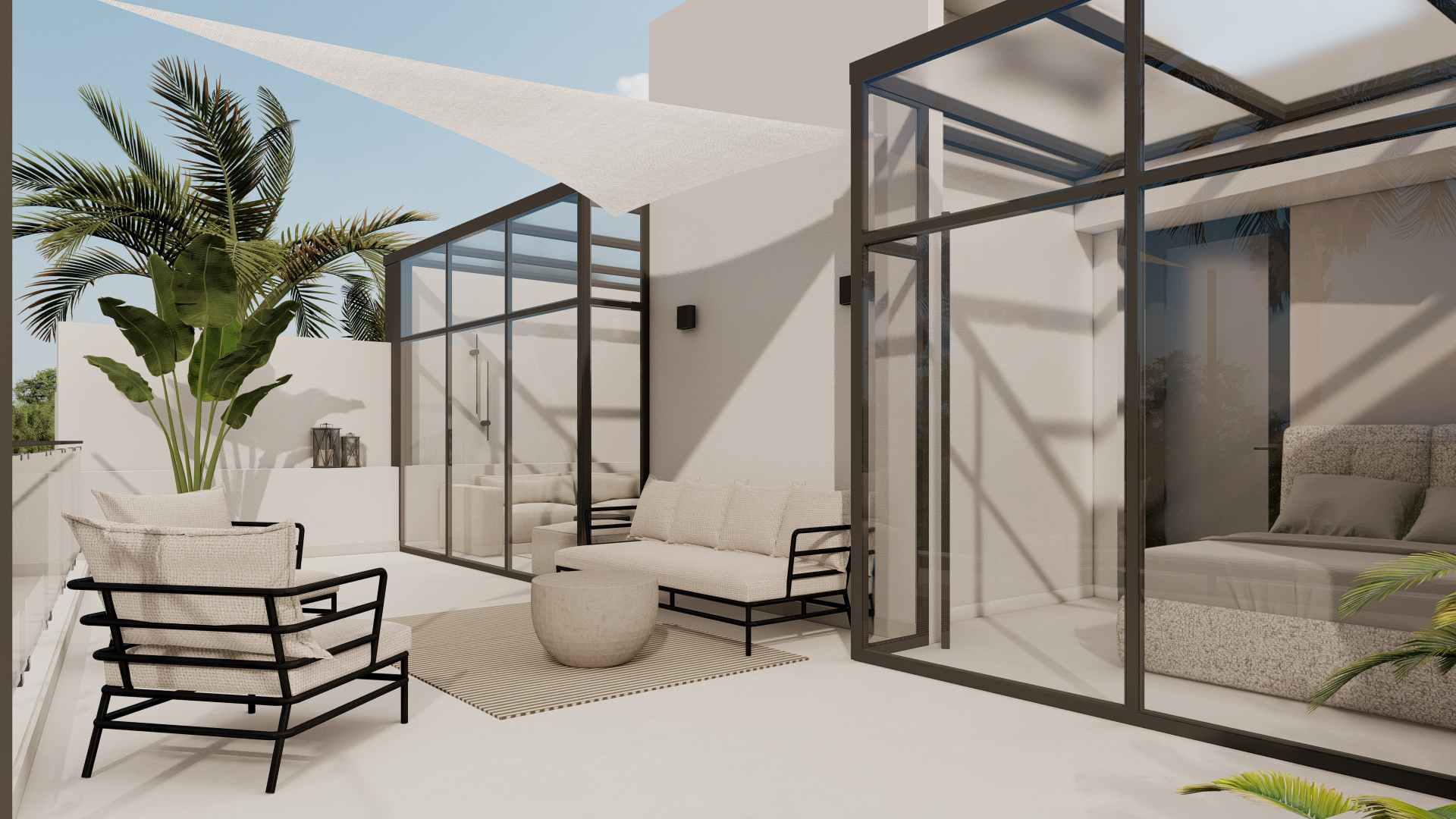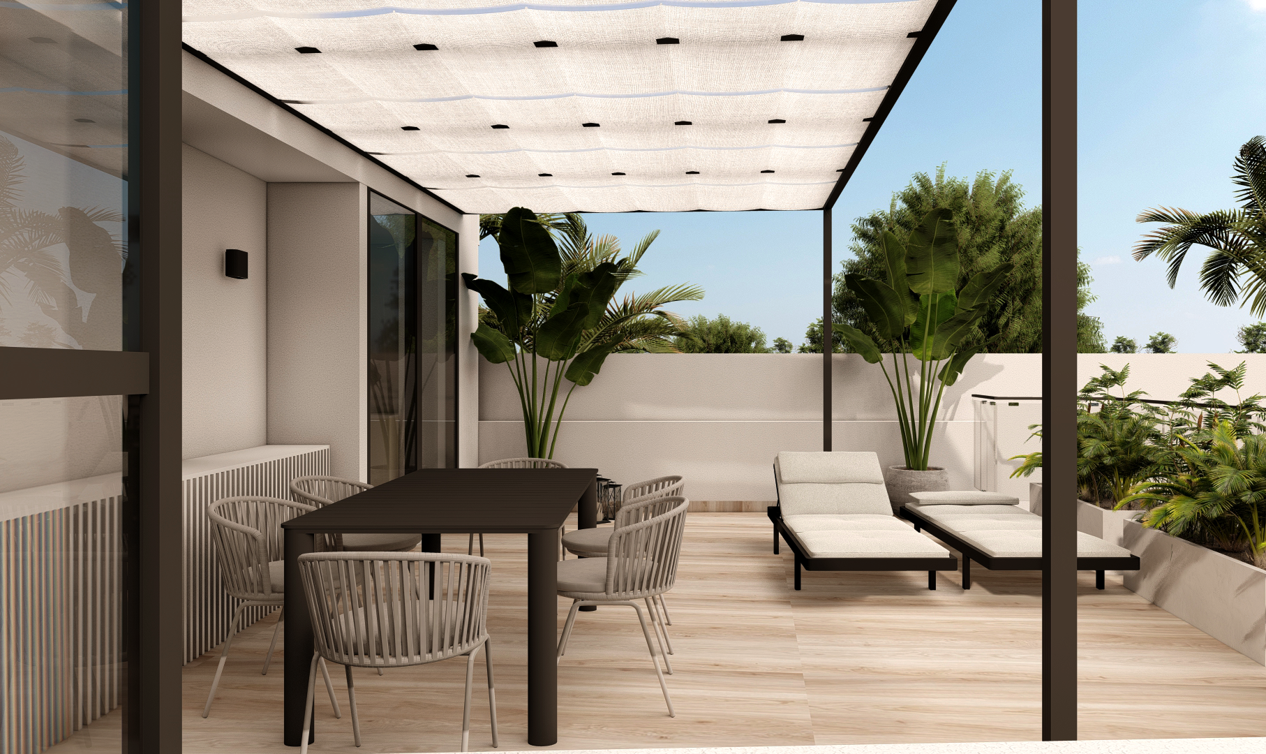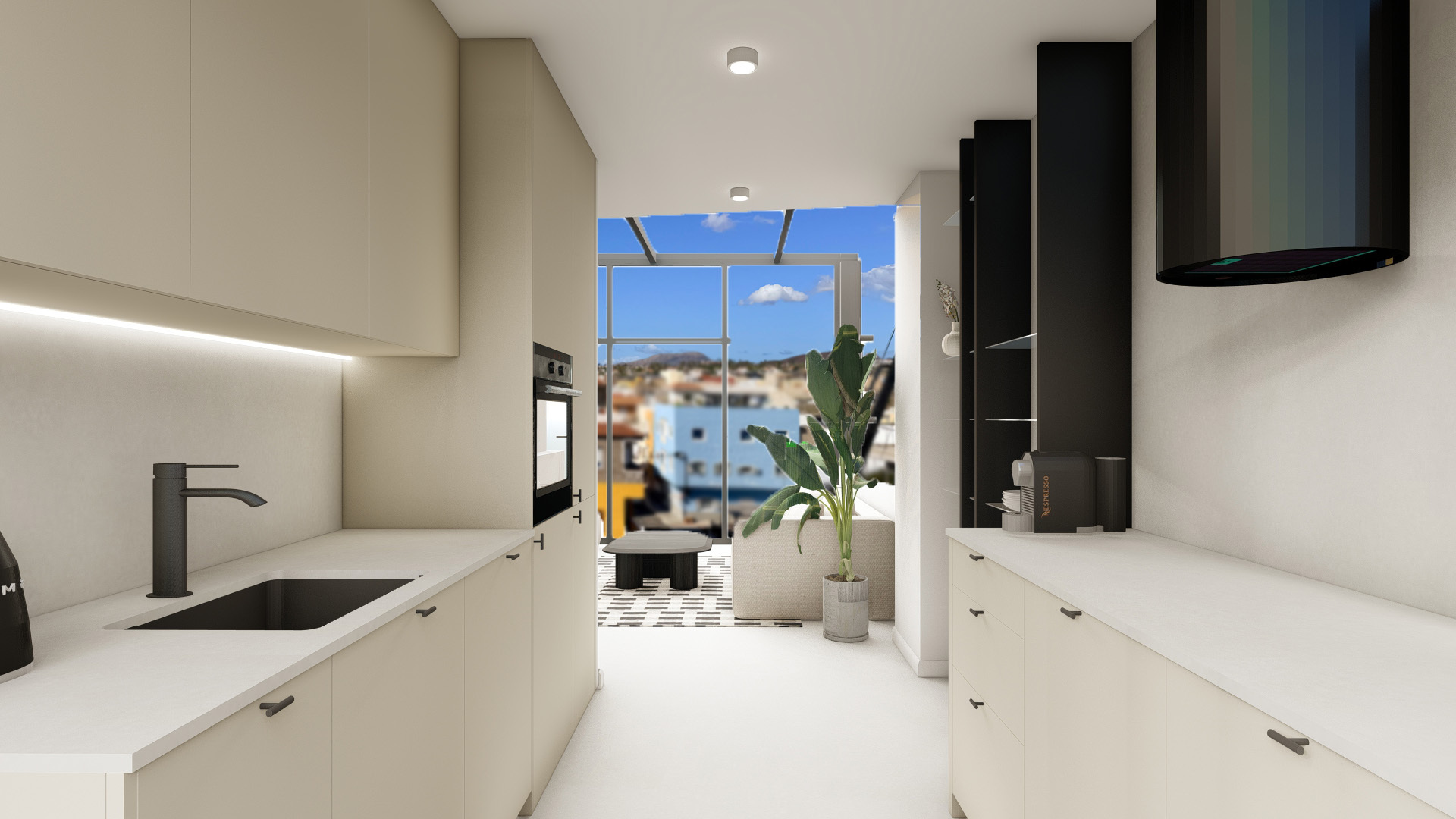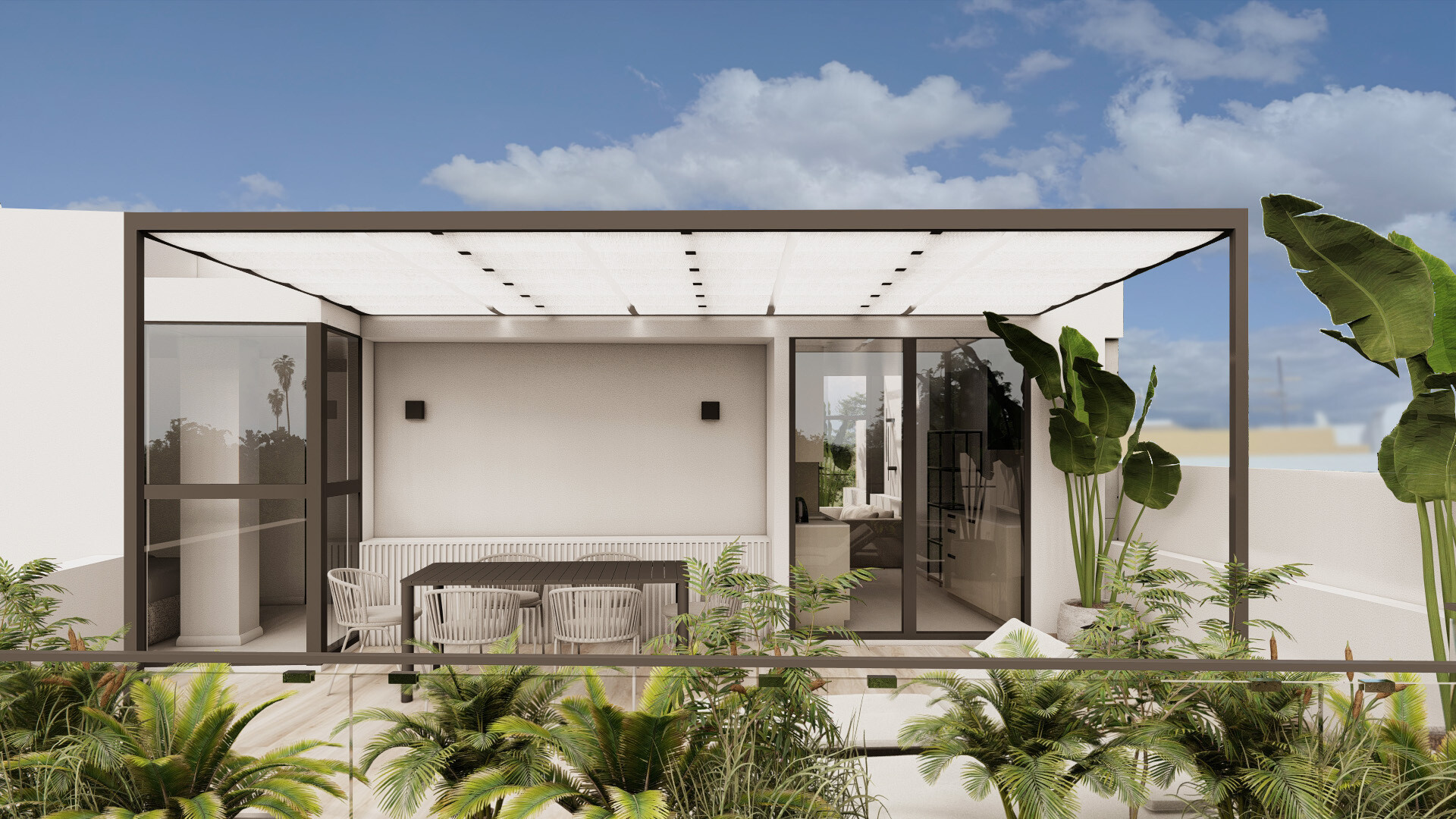 El penthouse cuenta con dos dormitorios, un salón, una cocina, un cuarto de baño, un comedor exterior y una terraza.
