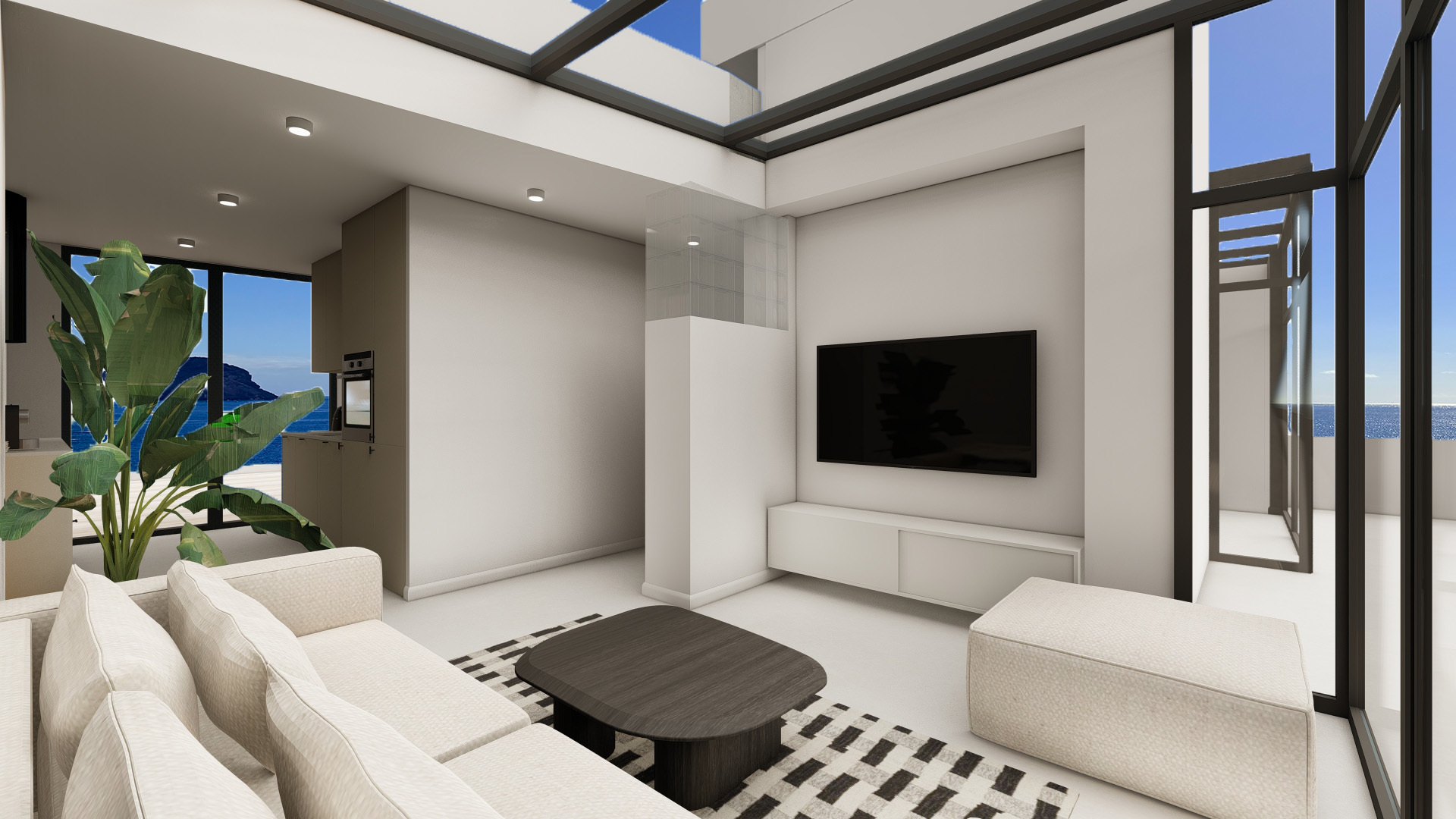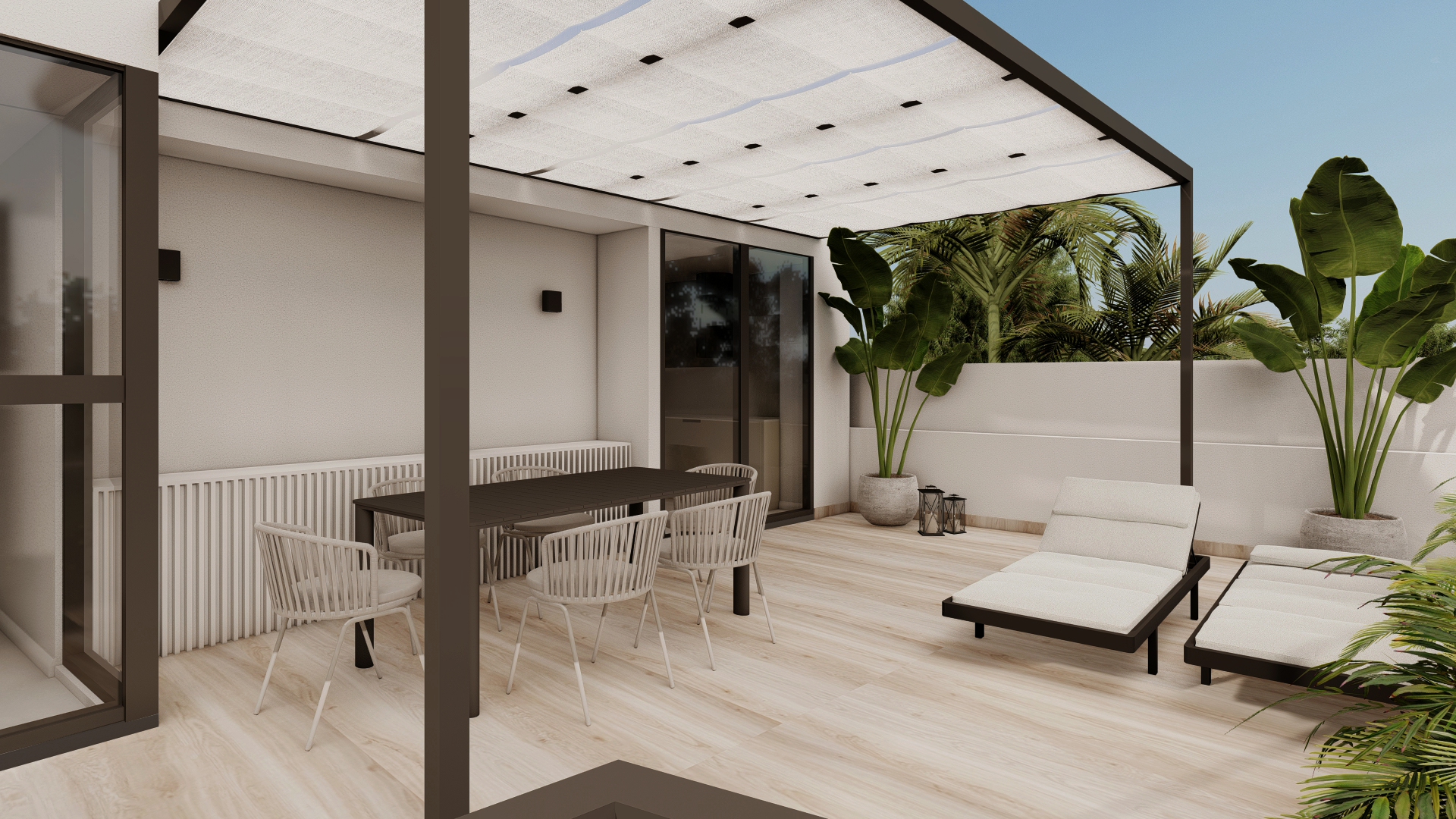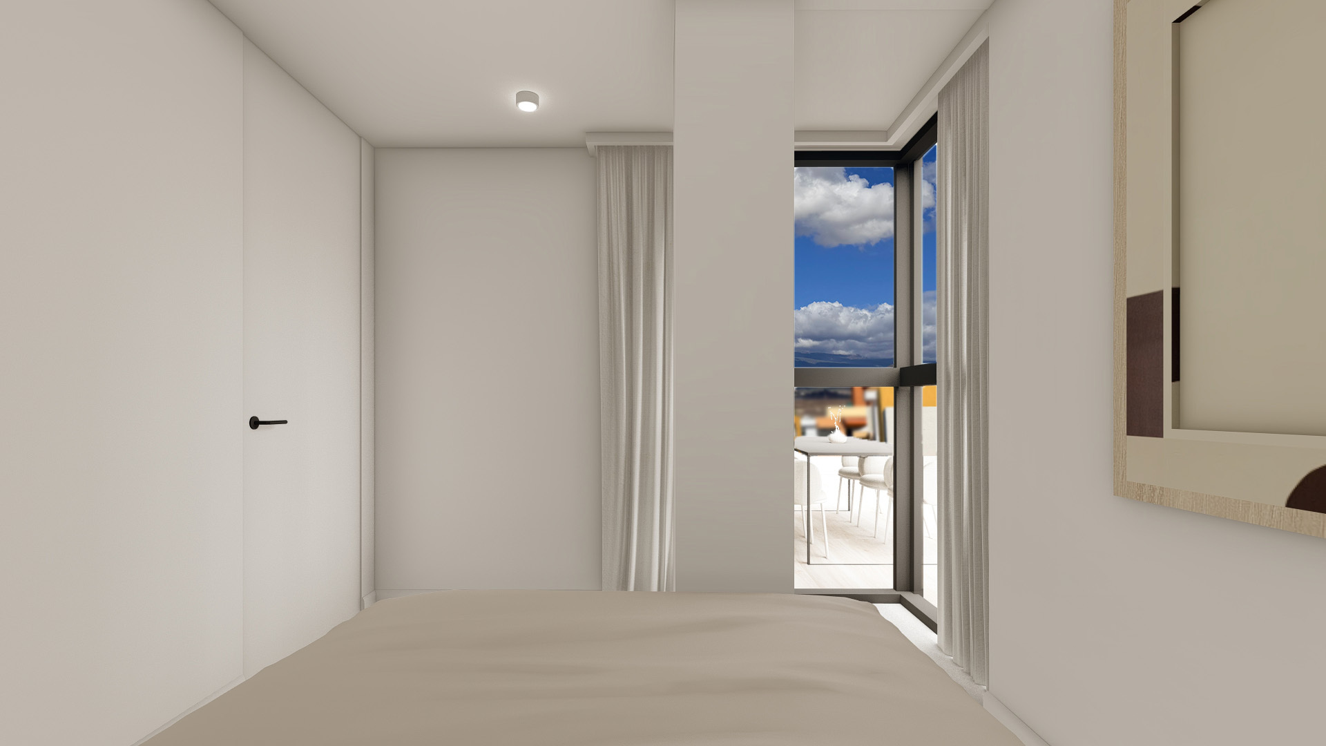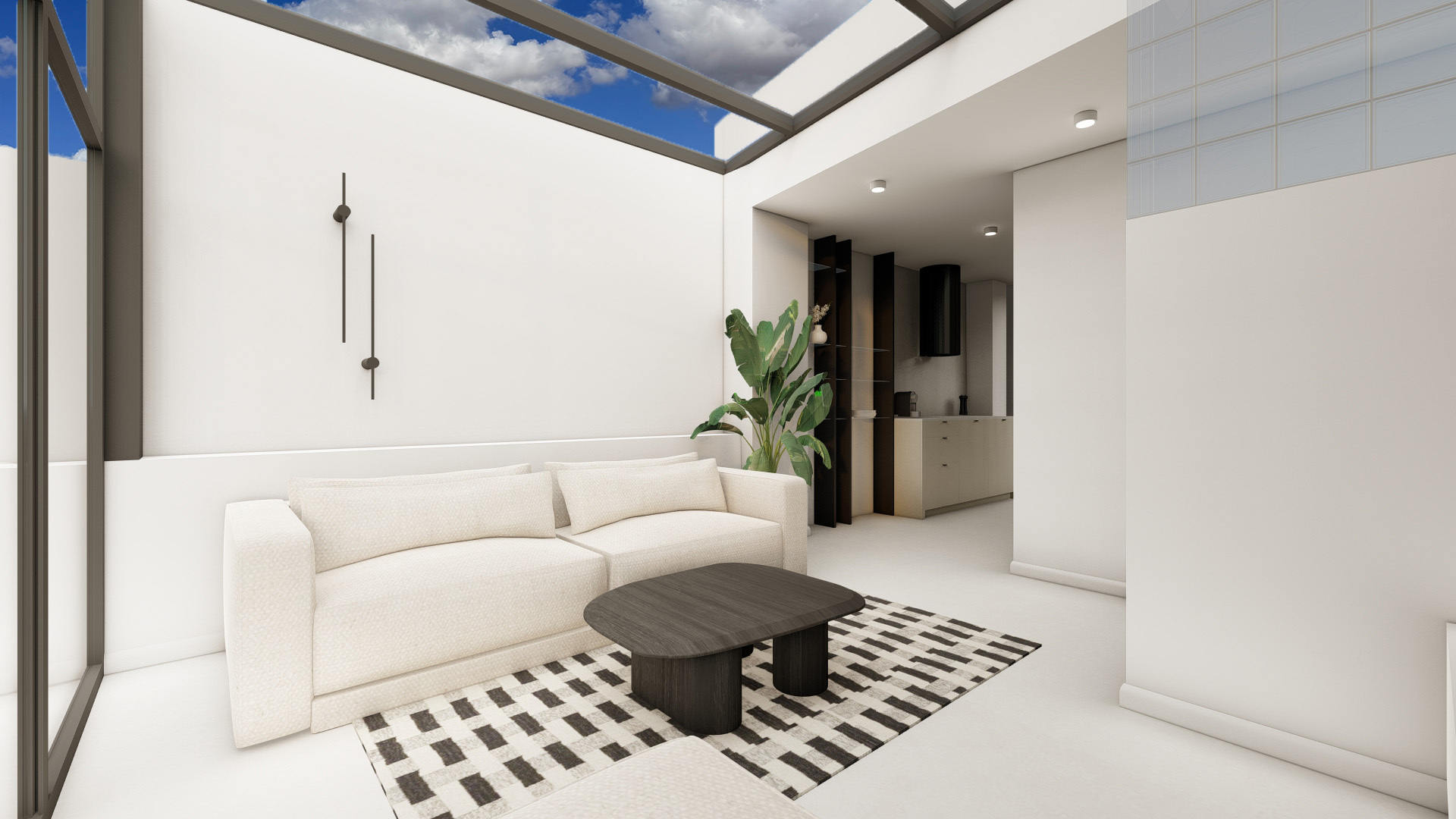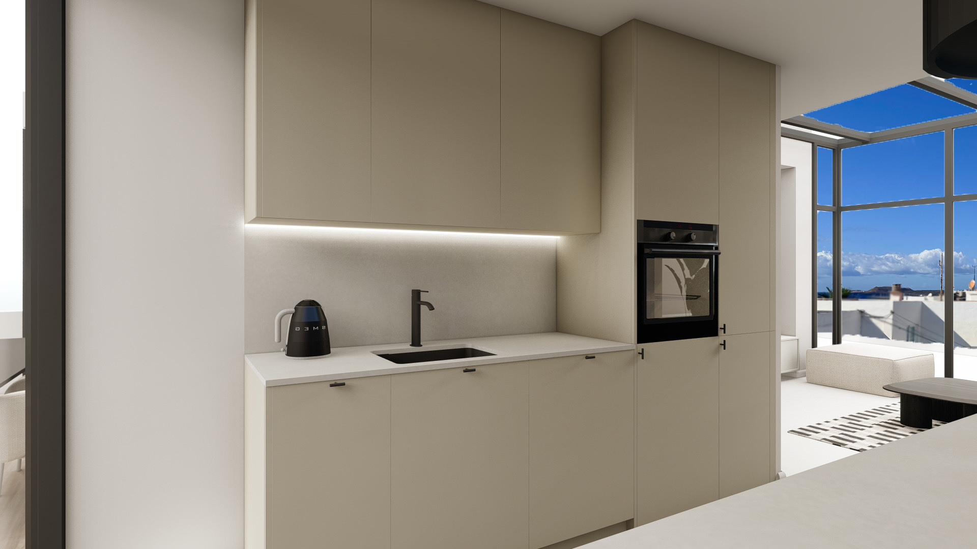 El penthouse cuenta con dos dormitorios, un salón, una cocina, un cuarto de baño, un comedor exterior y una terraza.