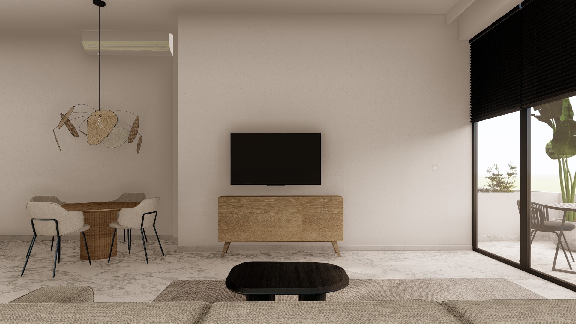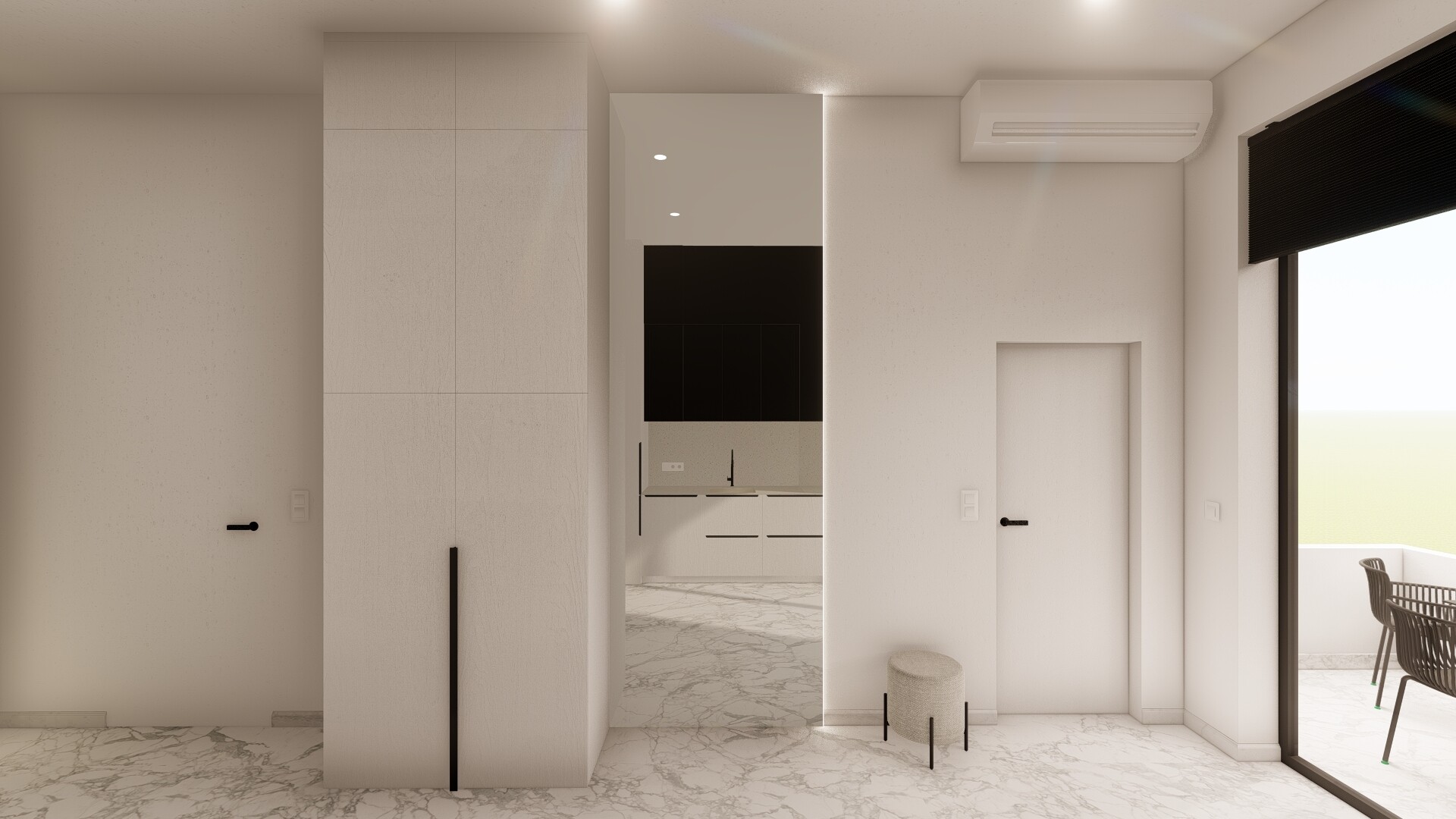 W apartamencie ulokowane są 2 sypialnie, salon z kuchnią, łazienka oraz taras.