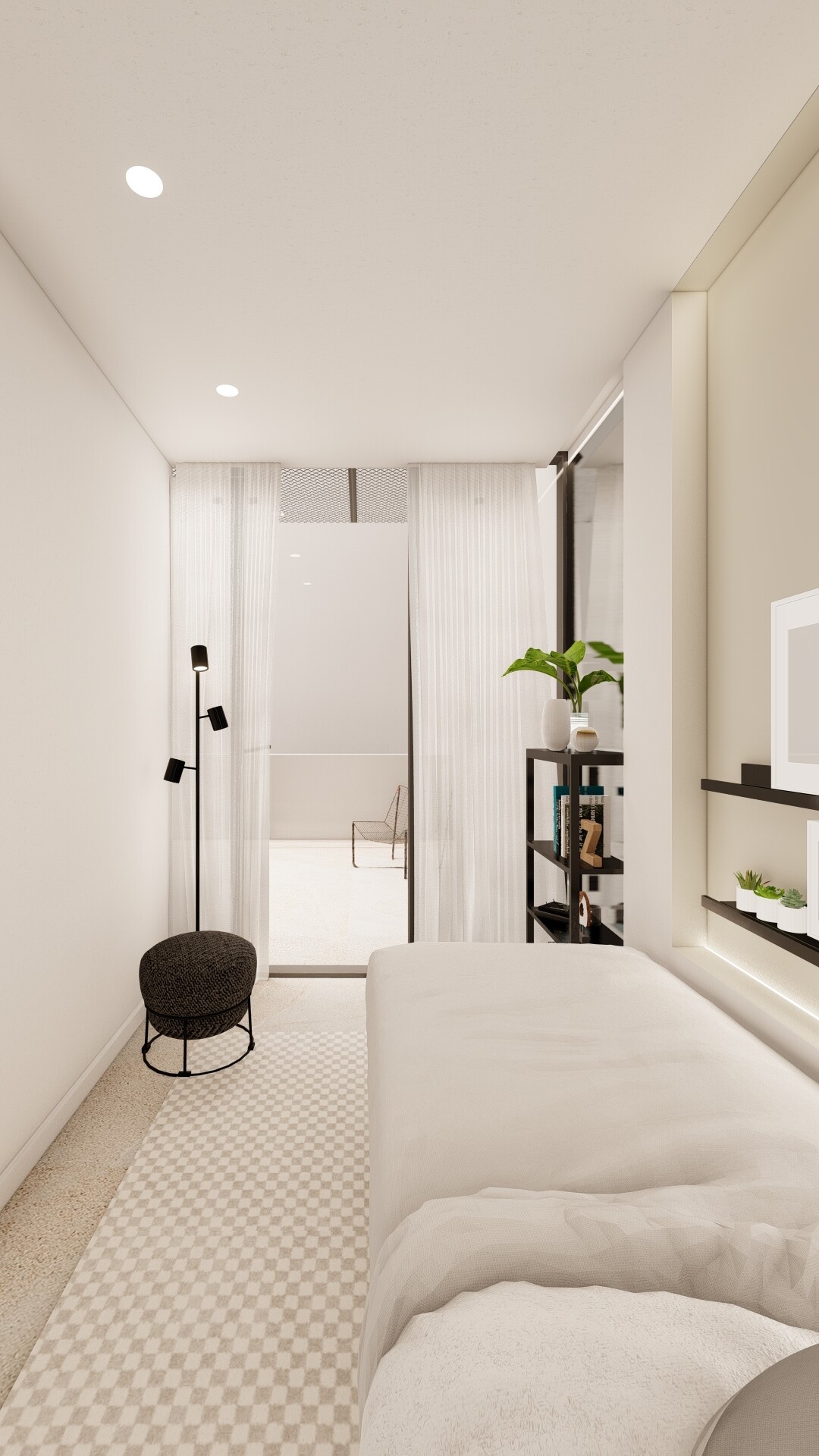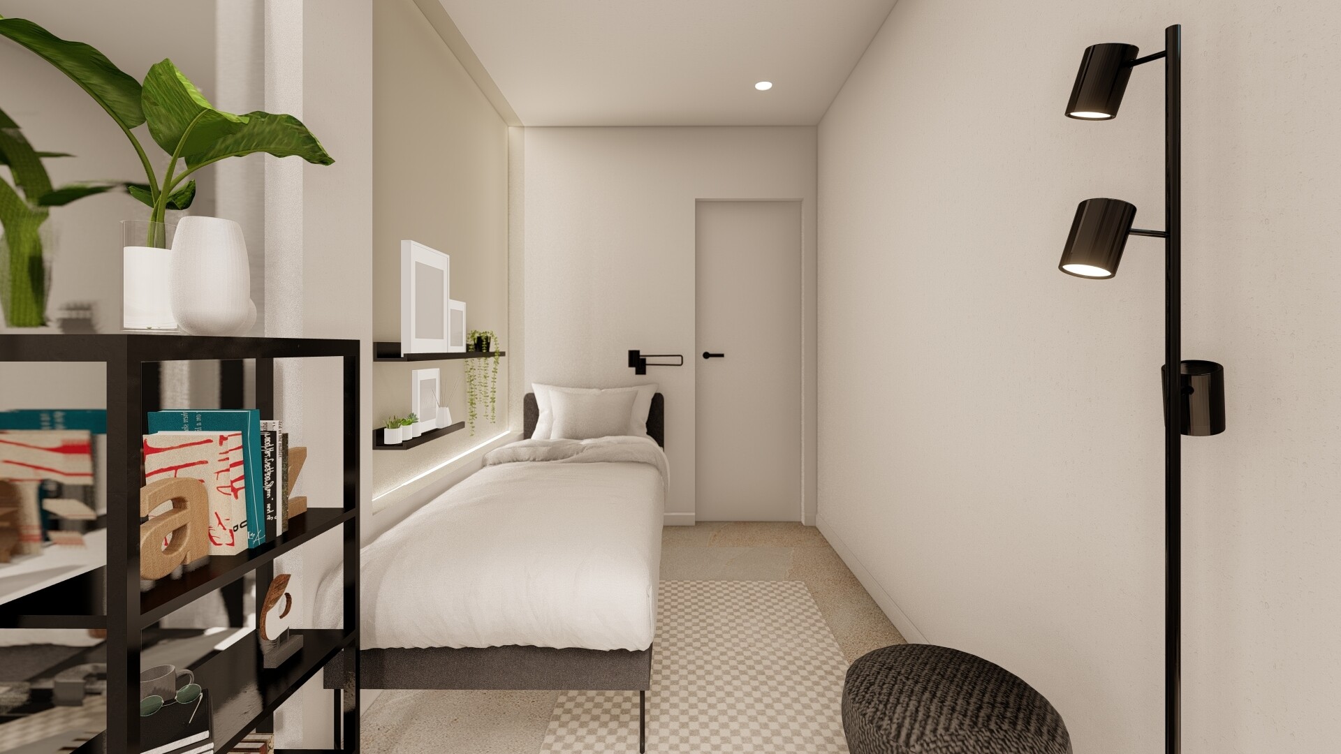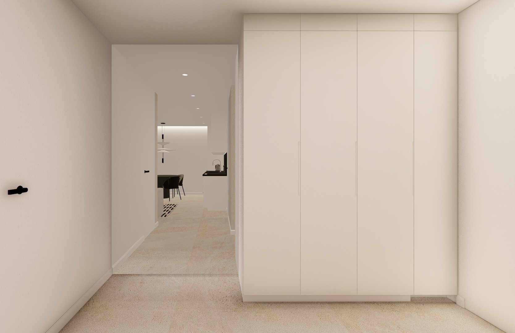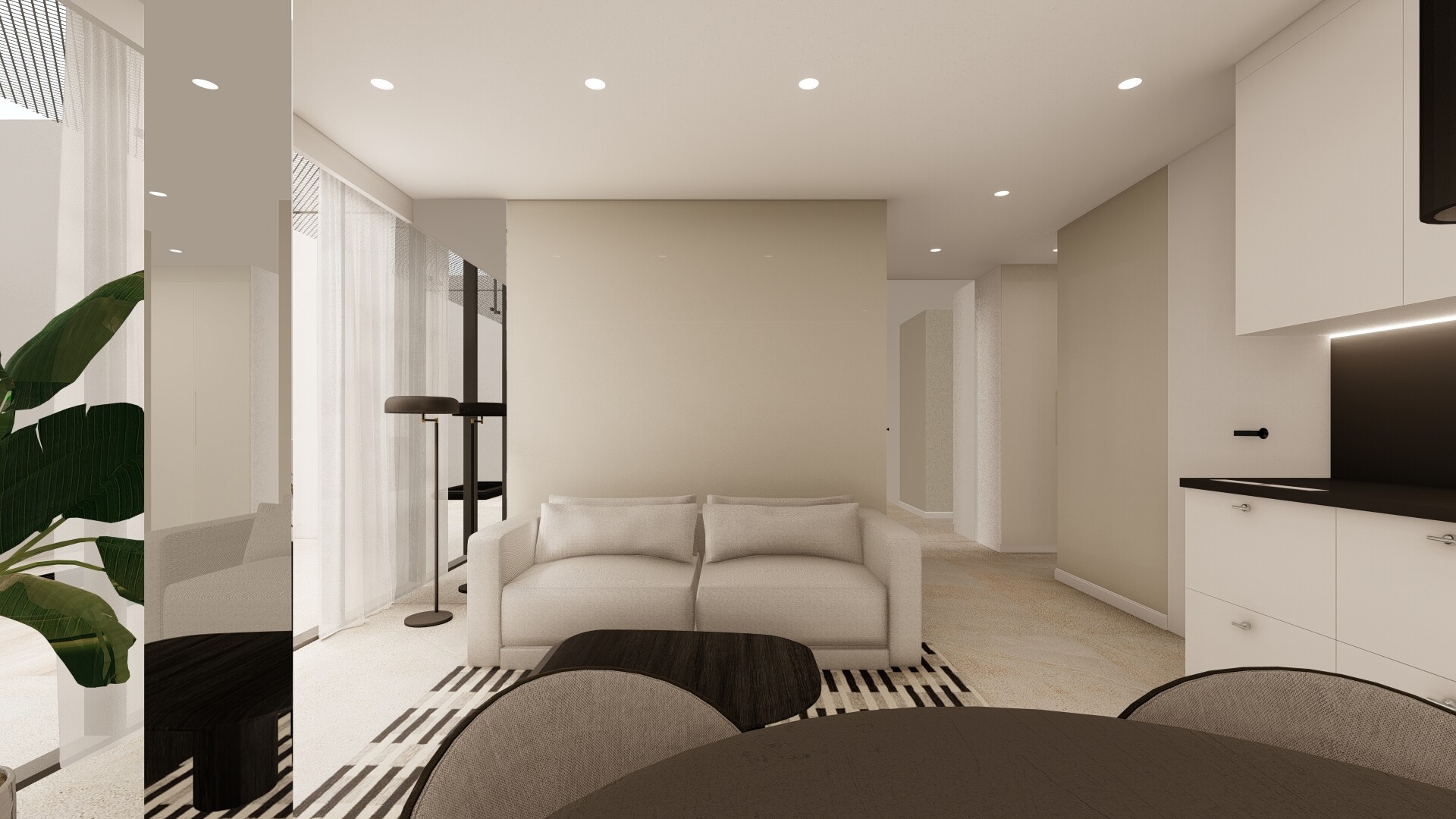 W apartamencie ulokowane są 2 sypialnie, salon z kuchnią, łazienka oraz taras.